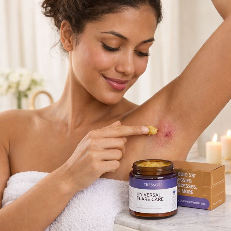 TRESSORI helps manage and soothe HS flare-ups, boils, cysts, abscesses, chafing, rashes, folliculitis, ingrown hairs, and irritated or broken skin.